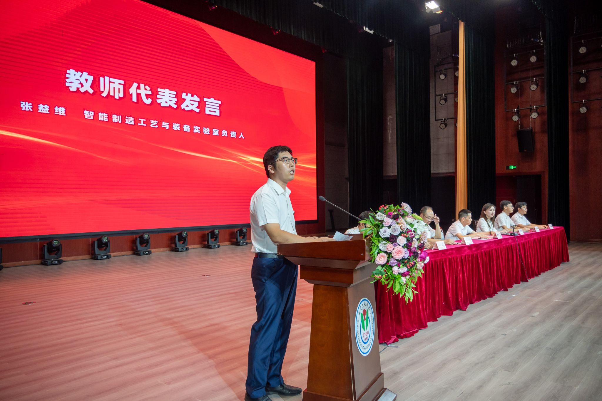 张益维老师作为教师代表发言,他以创新、实干为主题,鼓励新生积极参与专业竞赛与创新创业实践,期望新生在大学四年锻造出工程师的严谨、科学家的思维与创业者的胆识,实现学业与梦想双丰收。