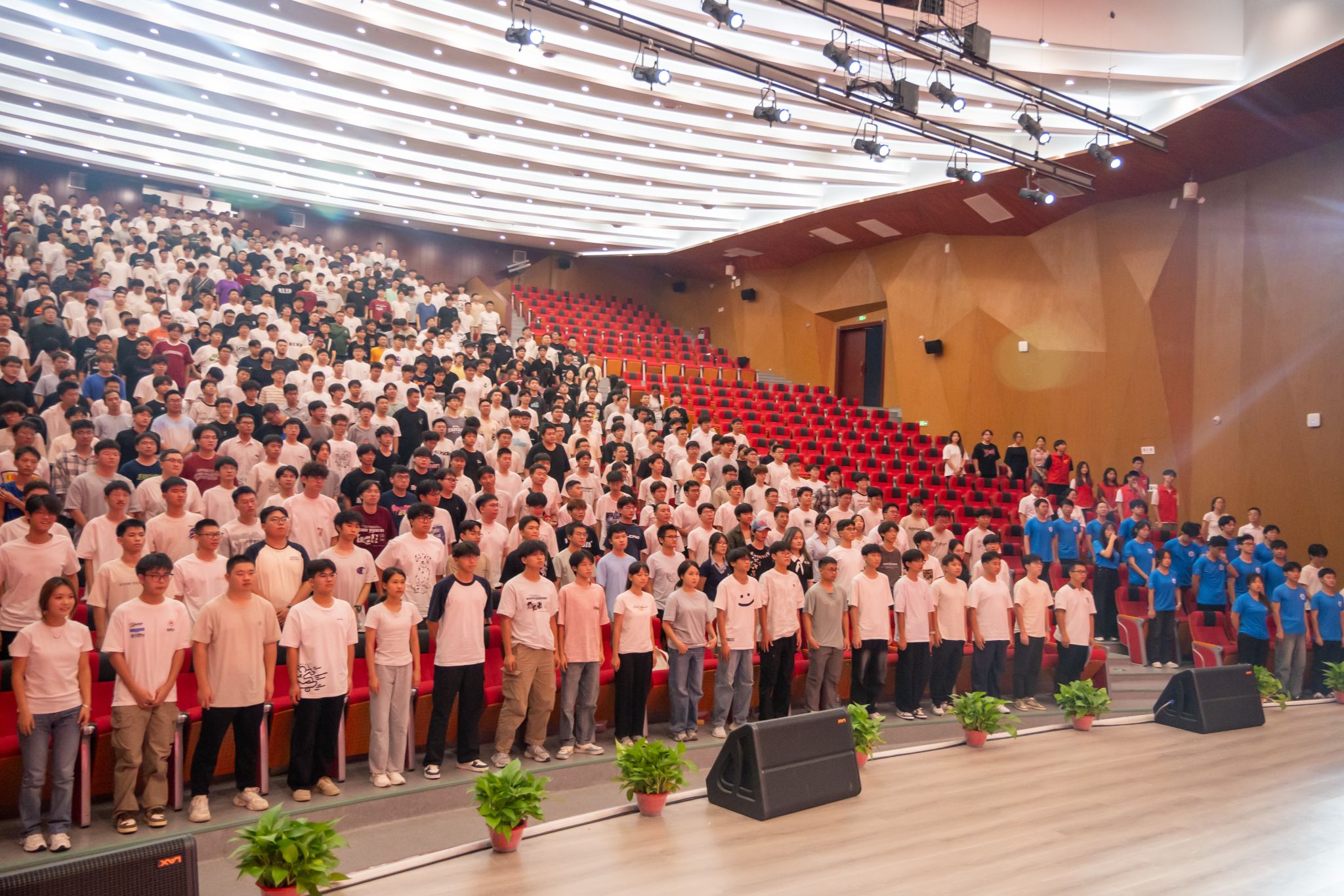 开学典礼在庄严的国歌声中拉开序幕,全场人员肃立齐唱,激昂的旋律中饱含着对祖国的敬意与对未来的憧憬。